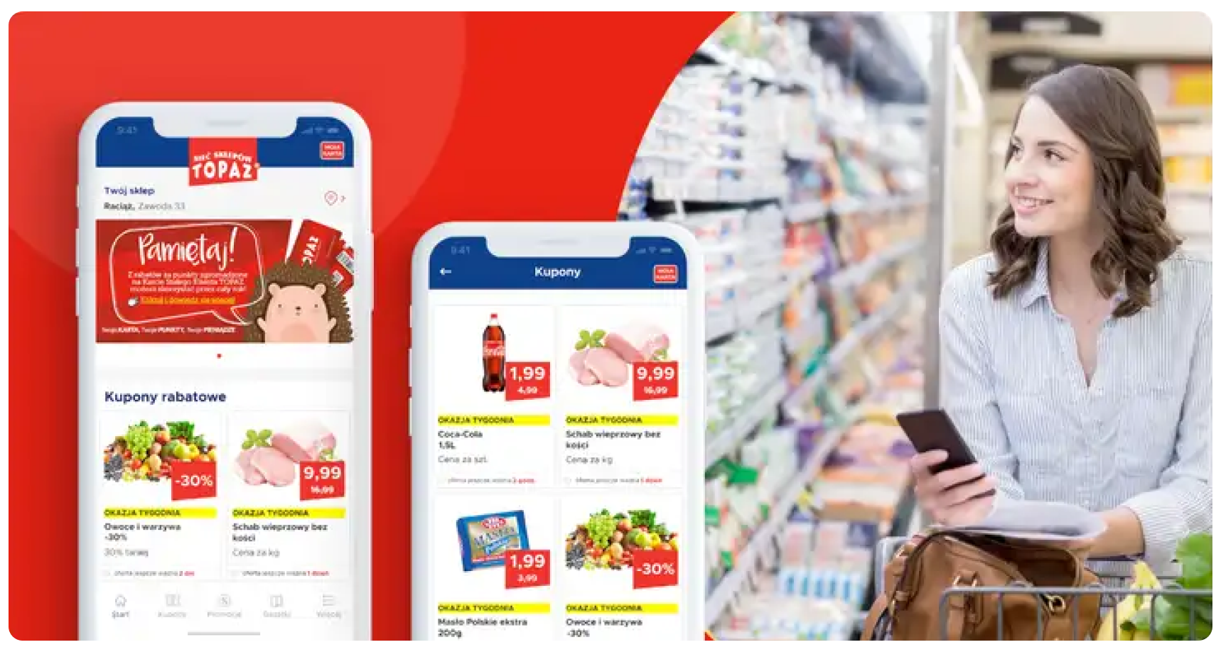 Sieć supermarketów Topaz potrzebowała aplikacji, która łączyłaby promocje, lojalizację i wygodę zakupów online w jednym miejscu. Wyzwanie polegało na zaprojektowaniu platformy, która przyciąga uwagę klientów, kieruje ją na kluczowe funkcjonalności (karta lojalnościowa, gazetki, kupony) oraz umożliwia planowanie zakupów zarówno w sklepach stacjonarnych, jak i online.